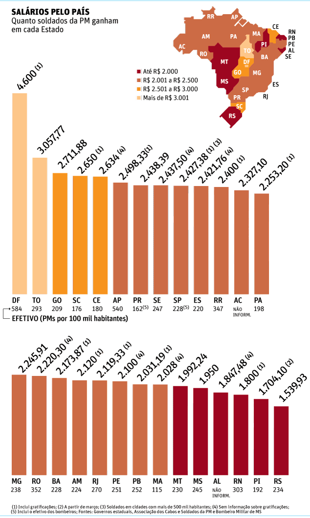 A média salarial paga no Brasil aos policiais militares em início de carreira está entre R$ 1.950 e R$ 2.650, e Sergipe remunera a classe com um percentual 15% acima do valor máximo da média salarial nacional. Com o salário de R$ 3.091,73, o estado de Sergipe passa a ocupar a segunda colocação no ranking nacional dos maiores salários da categoria, e não a oitava posição como foi erradamente publicada na edição do último dia 12.